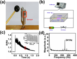 柔性力敏传感器因能方便地贴附于各种复杂不规则的表面上,正越来越受到人们的重视。目前报道的压阻型柔性力敏传感器都不能测高频信号,以至人们也认为压阻型柔性力敏传感器不能测高频信号,因为其应力加载是通过传感单元的机械形变,那么响应速度取决于材料的形变和恢复速度,故(通常)不能测高频信号。本团队将三维石墨烯复合并嵌入在PDMS内部,并用其制备了柔性力敏传感器,其中三维石墨烯为传感材料,PDMS为基体;同时以机械形变和基体中传播的声波加载应力,因而可同时测量动静态信号并具有较高的频响特性。本团队研制的传感器具有易于制备、成本低、频响特性高、耐用环境适应性强、操作方便等优点,可用于测试压力、地震波、振动、超声波、冲击波、瞬态压力等,将会在机械设备、道路、桥梁等的振动监测、机器人、电子皮肤(智能假肢)等领域得到应用。研究结果已在Appl. Phys. Lett.ACS Appl. Mater. Interfaces、Sensor.等杂志上发表,将会促进压阻型柔性力敏传感器相关理论的发展,拓宽压阻型柔性力敏传感器的应用范围。