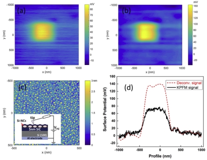 李卫团队的许杰博士在理论上采用格林函数分析方法,建立了开尔文显微探测过程中探测信号与真实表面电势信号之间的二维卷积关系模型,并通过有限元数值计算,定量获得了卷积运算的冲击函数(或点扩散函数);然后在实验中制备了硅基低维纳米结构,利用开尔文扫描探针技术探测了该结构的荷电图像;最后根据维纳滤波方法,从原始信号中解卷积出真实的表面电势信号,从而对此结构中的电荷注入进行了定量的分析研究。