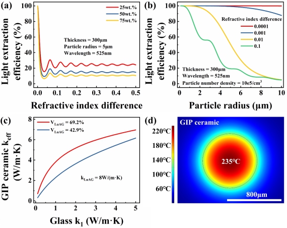本工作提出了一种高流明效率、高热导率的GIP陶瓷荧光体。其采用折射率匹配技术精确调控玻璃的折射率及色散使其与荧光粉具有较高匹配度的色散曲线从而提高了荧光陶瓷的光提取效率实现了14.5 W/mm2功率密度下205 lm/W的绿光输出。此荧光体具有高流明效率、容易制备等优点,是一种实用性优异的激光荧光体。论文第一作者为我院博士生张琦,该文章发表在Optics Letters