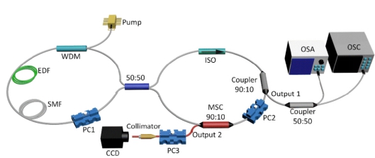 目前,产生柱矢量激光主要包括自由空间器件或者全光纤的方法。其中,自由空间器件主要包括相位调制器、组合半波片、双折射晶体等,对器件的精密度要求高、光路难集成、成本高。全光纤方法中利用光纤错位耦合激发高阶模所产生的模式损耗大,柱矢量激光斜率效率低、输出功率小。因此,该工作设计并实现了一种具有更高耦合效率和模式转换效率的模式耦合器,如图下图所示,利用8字谐振腔中构成的非线性放大环形镜充当可饱和吸收体进行锁模,当调节第一偏振控制器时,在输出端输出超短光脉冲。