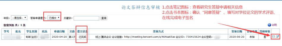 导师登录“研究生教育管理系统/学位论文/导师/学位论文管理/论文答辩信息管理”对学生答辩申请进行审核,点击页面右侧笔记图标查看研究生答辩申请相关内容,审核确认后,点击页面右侧书本图标确认“同意答辩”,填写导师对论文的学术评语,并点击“签名”图标在线完成电子签名。