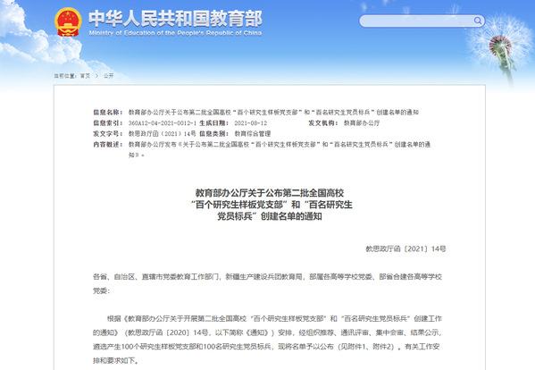 8月20日,第二批全国高校“百个研究生样板党支部”和“百名研究生党员标兵”创建工作评审结果公布。我院博士第一党支部入选第二批全国高校“百个研究生样板党支部”。这是继我院博士研究生李双德入选全国首批高校“百名研究生党员标兵”后,学院党建又一个标志性成果。我院也是全国为数不多同时入选“百个研究生样板党支部”和“百名研究生党员标兵”创建名单的学院。