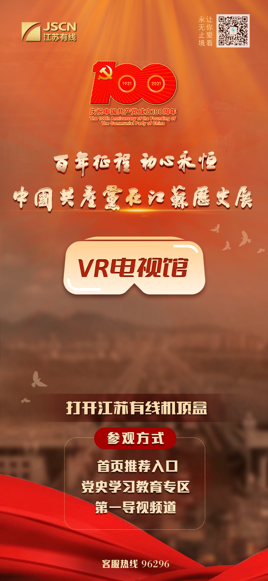 3、进入江苏有线电视机顶盒-木瓜视频--政务-党史学习教育专区,即可观看“百年征程 初心永恒——中国共产党在江苏历史展”VR电视馆展览轮播;点击宣传海报也可点播观看。