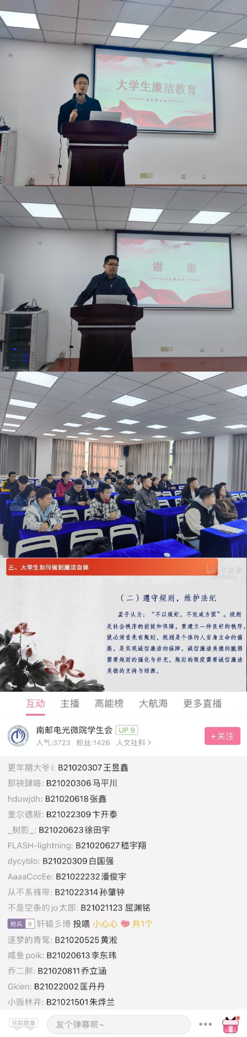 为深入开展廉洁教育,提高大学生廉洁素养,11月10日中午,我院在学科楼B322开展“廉洁清风劲、扬帆新征程”新生主题廉洁教育,学院专职纪检委员宋健康作专题教育,学院党委副书记高翔主持教育会。本次廉洁教育采用线上线下相结合的方式,部分新生代表在主会场参加,其他新生通过叮叮直播平台线上参会。