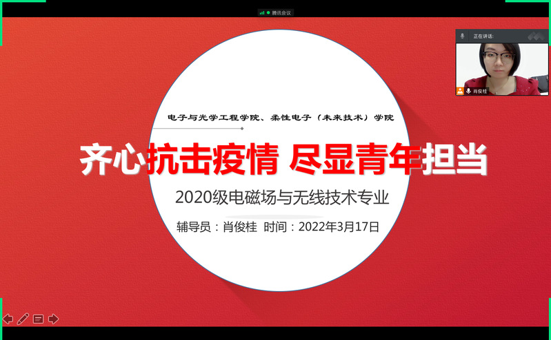 为落实校园疫情防控要求,做好校园安全教育工作,3月17日晚,木瓜视频 2020级电磁场与无线技术专业于线上召开“齐心抗击疫情 尽显青年担当”主题年级大会。本次会议由辅导员肖俊桂老师主持,学院2020级电磁场与无线技术专业全体学生参会。