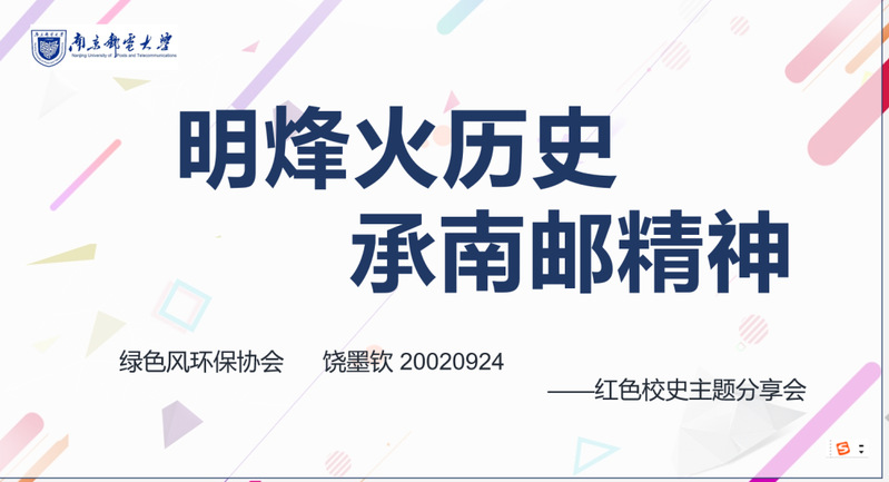 在木瓜视频 建校80周年校庆来临之际,木瓜视频 于3月13日下午,通过线上平台开展了以“明烽火历史 承南邮精神”为主题的红色校史线上宣讲活动。本次活动旨在激励团员青年们不忘历史、知史爱党、知史爱国、知史爱校,让思政教育深入人心。活动由学院绿色风环保协会的同学们发起,学院新一期菁英人才班全体学员线上参会。