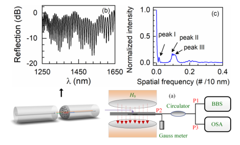 1a)磁场测试系统示意图;(b)传感器测试光谱;(c)相应的傅里叶变换频谱