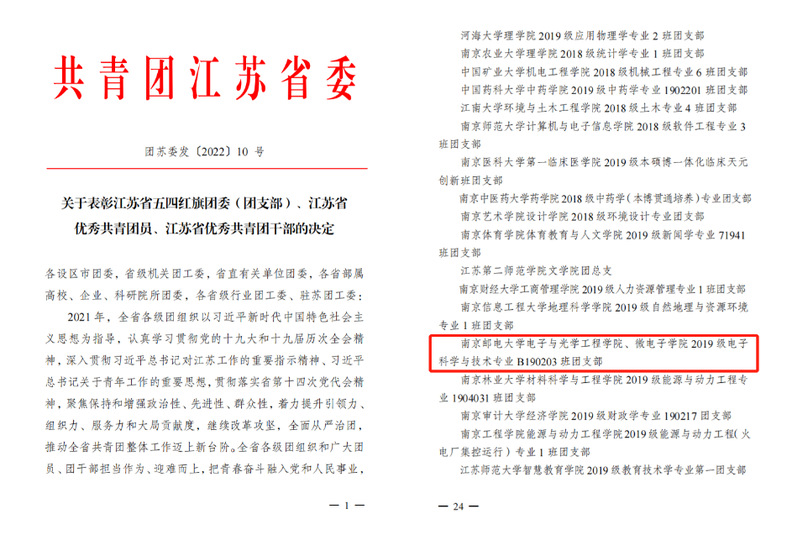 日前,共青团江苏省委发布“关于表彰江苏省五四红旗团委(团支部)、江苏省优秀共青团员、江苏省优秀共青团干部的决定”,授予木瓜视频 木瓜视频 2019级电子科学与技术专业B190203班团支部“江苏省五四红旗团支部”称号。