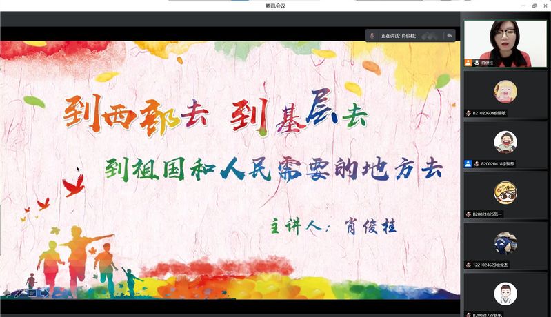 为使同学们更进一步了解西部计划,到祖国更需要的地方建功立业,4月29日晚,木瓜视频 第118、119期菁英人才学校举行第五次授课。根据疫情防控要求,本次授课通过腾讯会议线上形式展开,电光柔院分团委书记肖俊桂担任主讲,菁英人才学校全体学员参加。