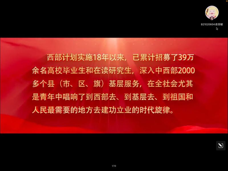 本次授课的主题为《到西部去,到基层去,到祖国和人民最需要的地方去》,旨在让同学们更深层次了解西部计划。课程中,主持人首先与同学们探讨了西部计划,随后通过视频放映的形式让同学们了解西部计划的一些志愿者们。接着,主持人具体地向大家讲述了西部计划的报名流程及一些注意事项。会议在主持人与同学们的互动中圆满结束。