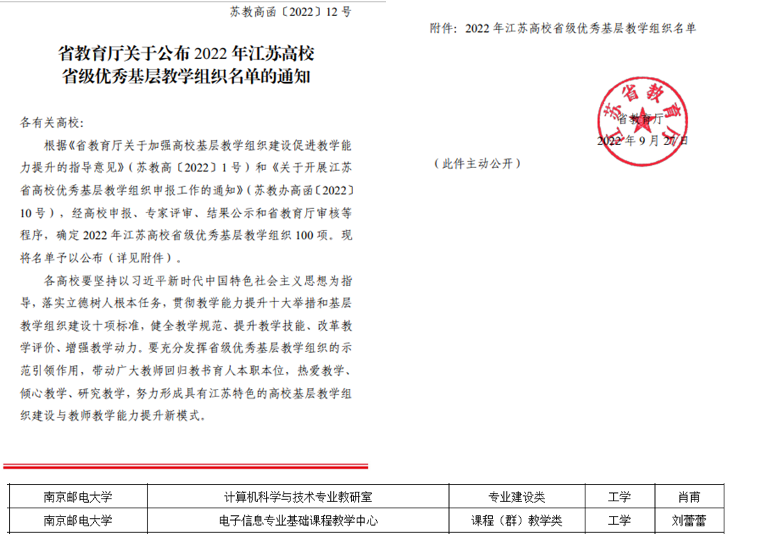 近日,省教育厅公布了2022年江苏高校省级优秀基层教学组织评选结果,我院“电子信息专业基础课程教学中心”是我校成功入选的两个基层教学组织之一。