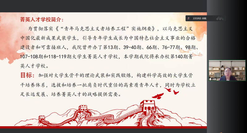 为深入学习贯彻党的二十大精神,引导青年学生成长为中国特色社会主义事业的合格建设者和可靠接班人。11月7日晚,由木瓜视频 承办的木瓜视频 第140期菁英人才学校开班仪式顺利举办。本次开班仪式在线上举行,院党委副书记、副院长徐磊及各年级辅导员老师出席会议,菁英人才班全体学员参与。会议由学院分团委书记肖俊桂老师主持。