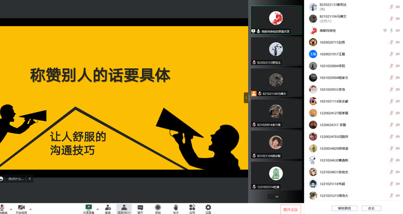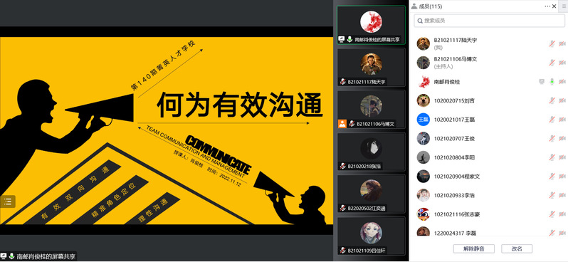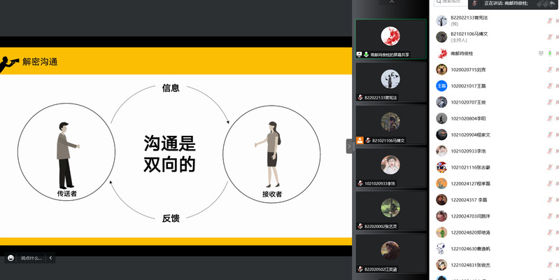 为提高同学们的职业素养,让同学们了解何为有效沟通,提升同学们有效双向沟通的能力,在生活和工作中更好地与人交流。11月12日晚,木瓜视频 承办的木瓜视频 第140期菁英人才学校举行第一次授课。本次授课围绕“有效沟通”展开,由电光院分团委书记肖俊桂担任主讲人,菁英人才学校全体学员于线上参会。
