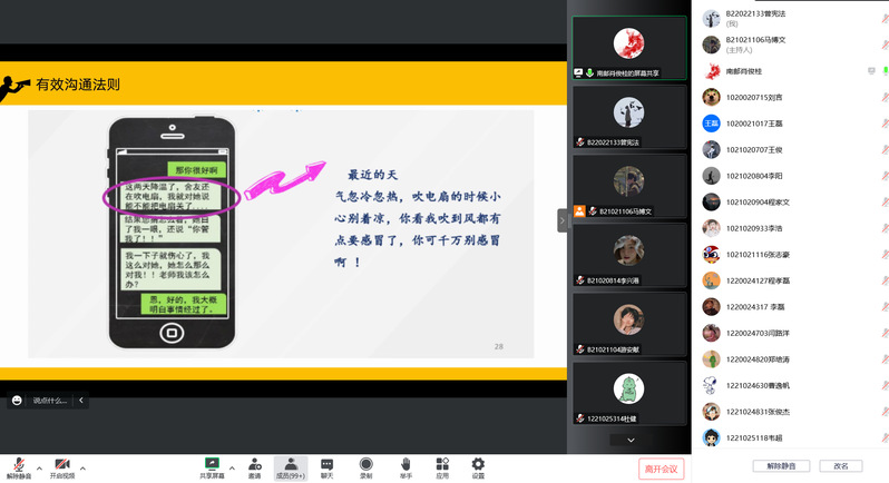 伴随课堂互动的穿插,肖老师向同学们抛出了“如何摆脱学习、生活中的沟通困境”等问题。随后,肖老师就实际问题给出了三条有效沟通法则“放下自利”“代以利他”“互惠互利”。在了解了有效沟通法则后,肖老师以真实案例,给出了几条提升有效沟通能力的方法,盘点了各种问题的解决思路,并借此给同学们提出了一些沟通方面的建议。
