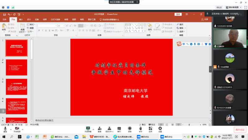11月11日下午,校关工委副主任储成祥教授为学校党校第483期暨木瓜视频 第42期入党积极分子培训班授课,主题为“时刻牢记党员条件,争做学生中的先锋模范”,213名培训班学员线上参加。