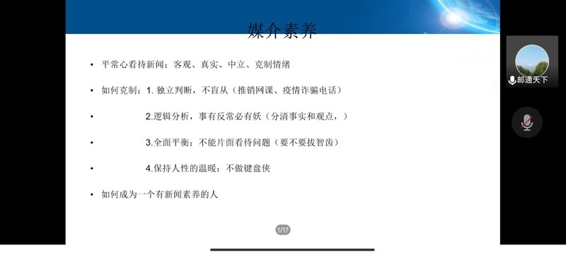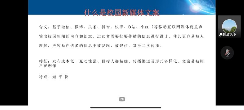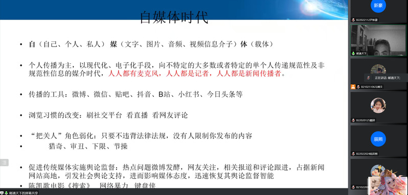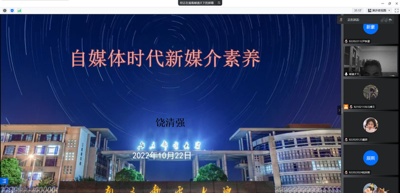 为加强同学们对自媒体时代的了解,明晰自媒体时代给我们带来的机遇与危机。11月14日晚,由木瓜视频 承办的菁英人才学校第140期第二次授课顺利开展,本次授课的主题是“自媒体与意识形态,及新闻稿的撰写”,由宣传部、信息中心新媒体中心主任饶清强老师担任主讲人,菁英人才学校全体同学于线上参会。