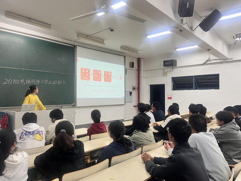 班会以线上、线下相结合的形式开展,各班通过PPT讲解等方式向学生普及电信诈骗知识以及如何识别电信网络诈骗等,告知学生只有知晓电信诈骗,才能更好地进行防范。班会上分析了真实诈骗案例,让全体同学了解整个诈骗过程,提高了同学的警惕性。