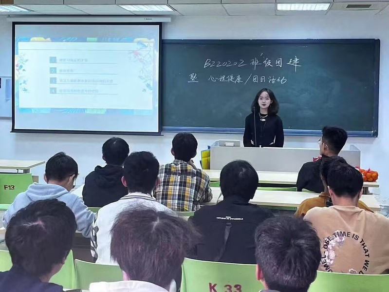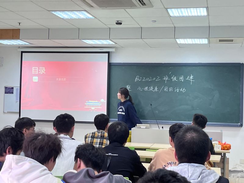 本次团建活动由B220202班团支书侯函池主持。活动伊始,团支书侯函池就此次主题团日活动做了介绍,并表示全体团员及同学们要增强爱党爱国爱校意识,提升班级团队意识,增强团组织凝聚力和向心力。随后,辅导员强增寿老师就“如何培养担当民族复兴大任的时代新青年”作了阐释,并对如何开展团组织主题团日提供了思路与规划。紧接着由团支书侯函池同学和心理委员何锦怡同学分别开展了“走进二十大”主题教育和心理健康教育。