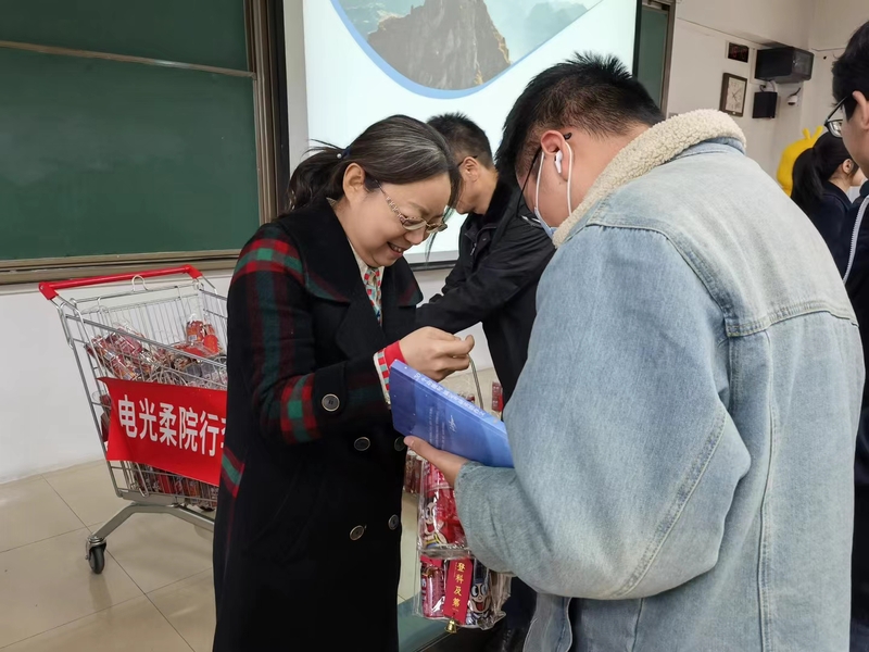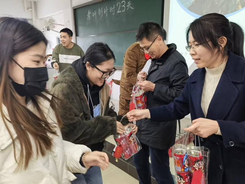学院领导老师们送出印有“金榜题名”“鱼跃龙门”等祝福语的福袋。老师们一边发放福袋,一边叮嘱同学们在考研冲刺阶段要注意防护、保重身体,鼓励大家稳定心态,争取一战成“硕”。一份份礼物不仅承载着学院的心意和祝福,也像春风抚慰每一位考研学子紧张的心灵。同学们收到福袋后备受鼓舞,纷纷表示一定会调整到最佳的冲刺状态,不辜负老师们的关心关怀和殷切期望。
