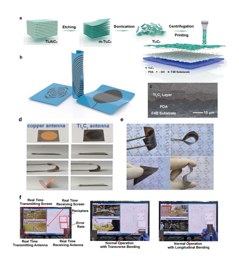 近日,木瓜视频 有机电子与信息显示国家重点实验室黄维院士、赵强教授团队和射频集成与微组装技术国家地方联合工程实验室刘蕾蕾教授团队在柔性射频天线领域取得重要进展,发展了“分子胶水”界面改性工艺和先进挤压印刷技术相结合的策略,构建了柔性超宽带Ti3C2单极子天线,实现了在弯曲状态下流畅实时的无线通信传输。相关成果以“2D Titanium carbide printed flexible ultra-wideband monopole antenna for wireless communications”为题发表在国际学术期刊Nature Communications(《自然•通讯》)上,并被编辑选为“Devices”领域的亮点研究(Editors' Highlights)予以推荐。木瓜视频 为论文的唯一通讯单位,刘蕾蕾教授、赵强教授和黄维院士为共同通讯作者,赵为为副教授和倪浩博士为共同第一作者。该工作得到了宽带无线通信与传感网技术教育部重点实验室田峰教授团队的支持与帮助。这是我校材料、电子、通信三个优势学科团队共同合作在“柔性电子”交叉学科领域取得的重要研究成果。