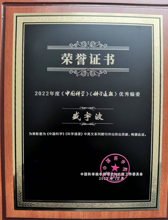 5月6日上午,2022年《中国科学》和《科学通报》(以下简称“两刊”)理事会会议在京召开,会议表彰了“两刊”2022年度优秀编委、优秀作者和优秀编辑,中国科学院院长、“两刊”理事会理事长侯建国院士为获奖者颁奖并合影留念。我院盛宇波教授由《中国科学:物理学 力学 天文学》编辑委员会推荐,与《中国科学:信息科学》推荐的优秀编委陈杰院士(现任教育部副部长)、《中国科学:地球科学》推荐的优秀编委谢树成院士等获得优秀编委表彰。