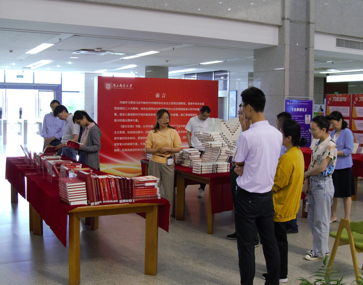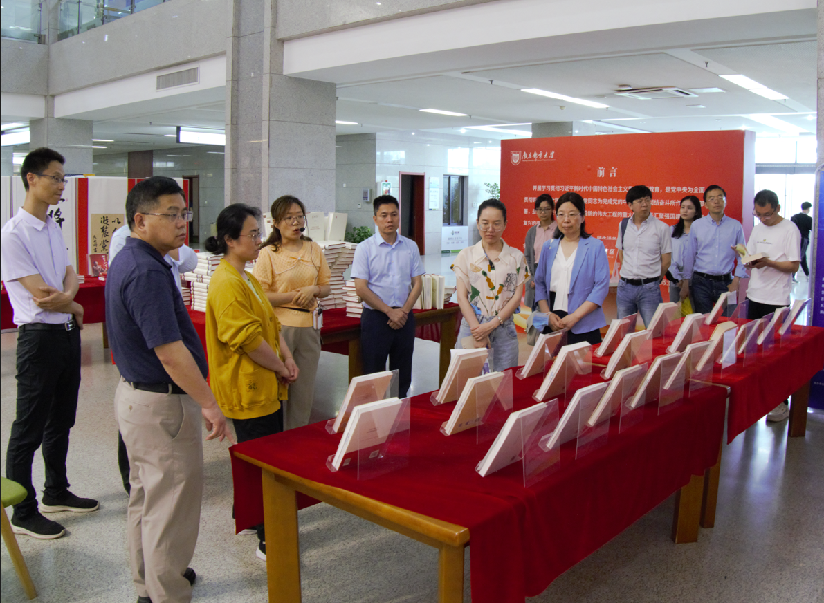 学习交流会后,党员同志们前往仙林校区图书馆,参观以“凝心铸魂向复兴”为主题的学习贯彻习近平新时代中国特色社会主义思想主题教育专题书展。专题书展陈列了复兴文库系列丛书以及“‘习语金句’大家写”优秀书法艺术作品,讲解员老师为大家详细介绍了专题书展陈列的系列图书,解读了“习语金句”的深刻内涵,同志们认真聆听讲解,在观展中用心感悟思想伟力,汲取奋进力量。