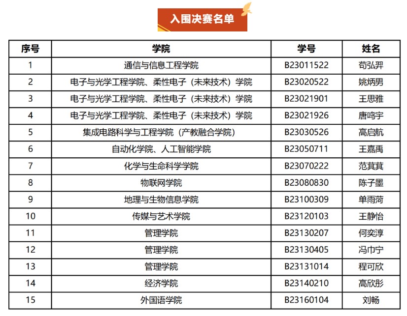 2023级新生军训期间,演讲比赛初赛100%覆盖全体新生,各学院新生经过激烈角逐,共有来自19个学院的57位同学脱颖而出,成功进入复赛。比赛现场我院6位选手自信满满、从容大方,他们用坚定的信念诉说了自己对家乡的赞美与期待。经过各位选手的精彩展示和评委打分,我院学子姚炳男、王思雅、唐鸣宇入围决赛,将再次角逐;鲍亭谕、张朝精、常宇浩拟授三等奖。
