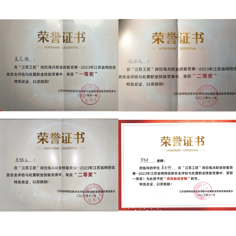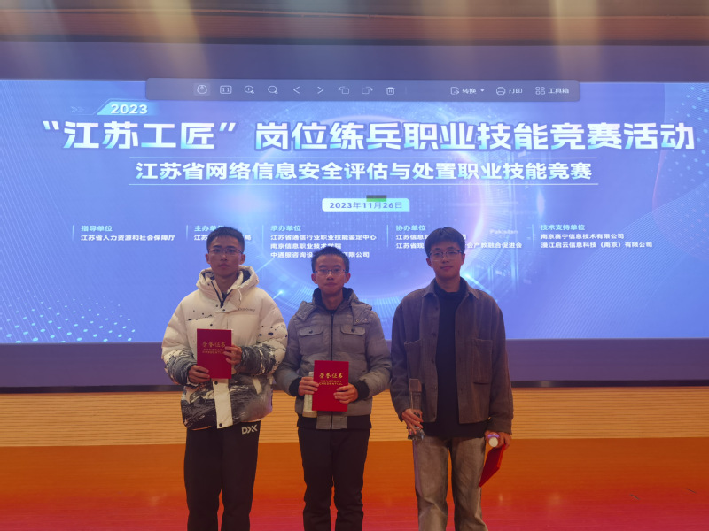 本次竞赛为省级一类竞赛,赛项共分为初赛和决赛两个阶段、职工组和学生组两个赛道,全省共计1200多名选手参加初赛,210名选手参加决赛,决赛于11月26日在南京信息职业技术学院举行。我院三名学生鏖战4个小时,经过综合理论考核、CTF解题考核、安全分析与运维考核、综合分析与报告考核等四个模块的比赛,最终获得了综合成绩学生组一等奖一名(袁思楠)、二等奖两名(徐泽成、黄鹤东)的好成绩;李华婷老师被授予“优秀指导教师”称号。在备赛期间,参赛团队合理安排训练计划,线上线下开展技术交流、战略战术讨论,突破疑难问题,坚持不懈,发扬了“不服输、敢争先”的精神。