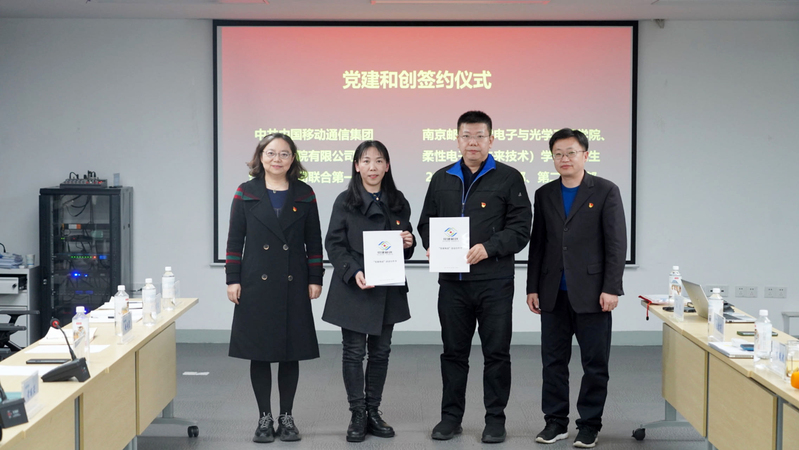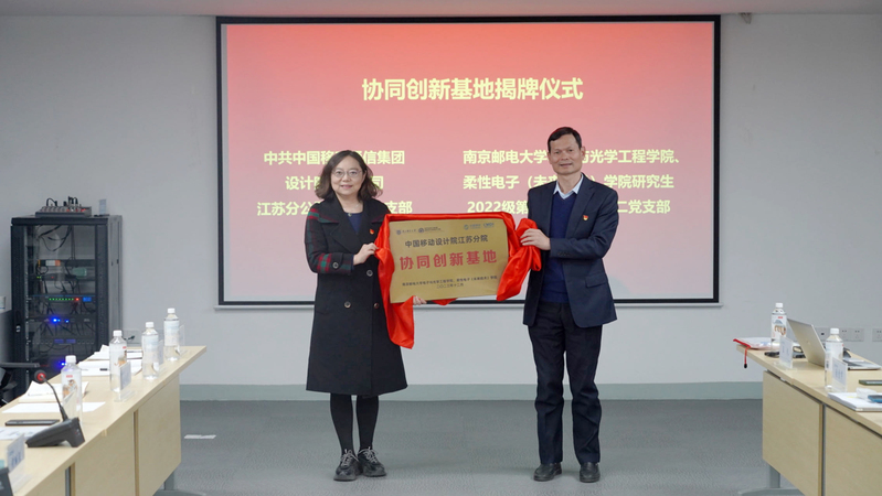 为深入学习贯彻党的二十大精神,坚持以习近平新时代中国特色社会主义思想为指导,落实新时代党的建设总要求,充分发挥基层党支部的主体作用,激发党员活力,12月7日下午,木瓜视频 电子与光学工程学院、柔性电子(未来技术)学院与中移设计院江苏分院联合第一支部协同创新基地揭牌暨党建共建签约仪式在中移设计院江苏分院一楼会议室举行。学院党委书记黄丽亚、党委副书记、副院长徐磊、中移设计院江苏分院党委书记、院长王翔、党委委员、副院长曾昭平、学院邹辉副教授出席揭牌仪式,学院2022级研究生辅导员、分院联合第一支部组织兼纪检委员、宣传兼青工委员、联合第一支部党员代表、部分学生党员代表参加会议。会议由中移设计院江苏分院党委委员、联合第一支部书记李凤武主持。