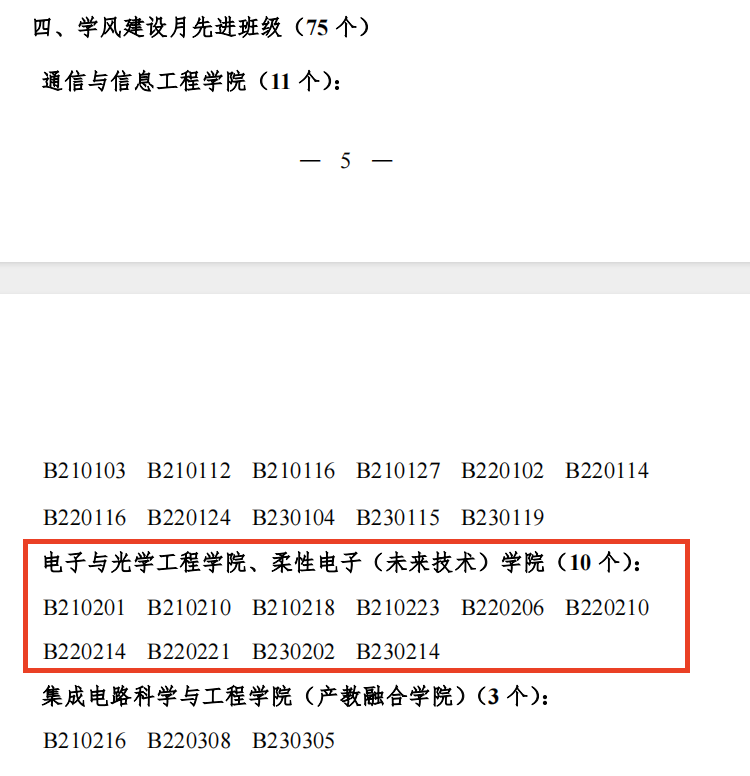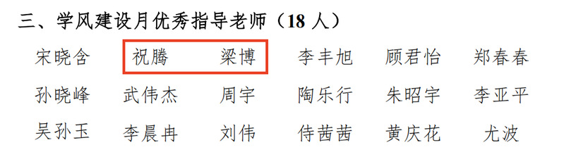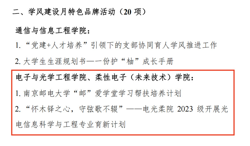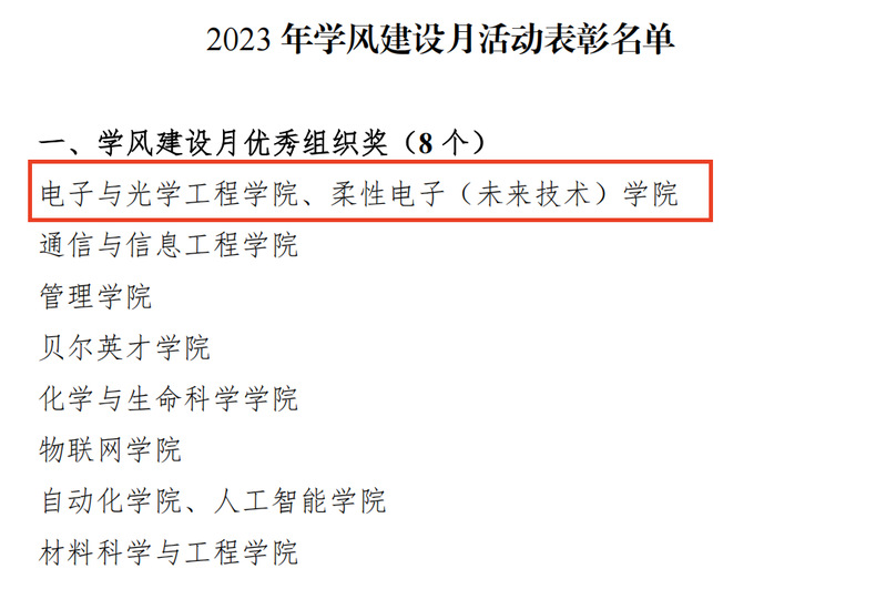 经学院积极组织申报,学生工作部审核差额评审,我院荣获“学风建设月优秀组织奖”;“木瓜视频 ‘邮’爱学堂学习帮扶培养计划”、“‘怀木铎之心,守弦歌不辍’——电光柔院2023级开展光电信息科学与工程专业育新计划”两项活动荣获“学风建设月特色品牌活动奖”;祝腾、梁博两位辅导员老师荣获“学风建设月优秀指导教师”称号;10个班级荣获“学风建设月先进班级”称号;123位同学荣获“学风建设月先进个人”称号。