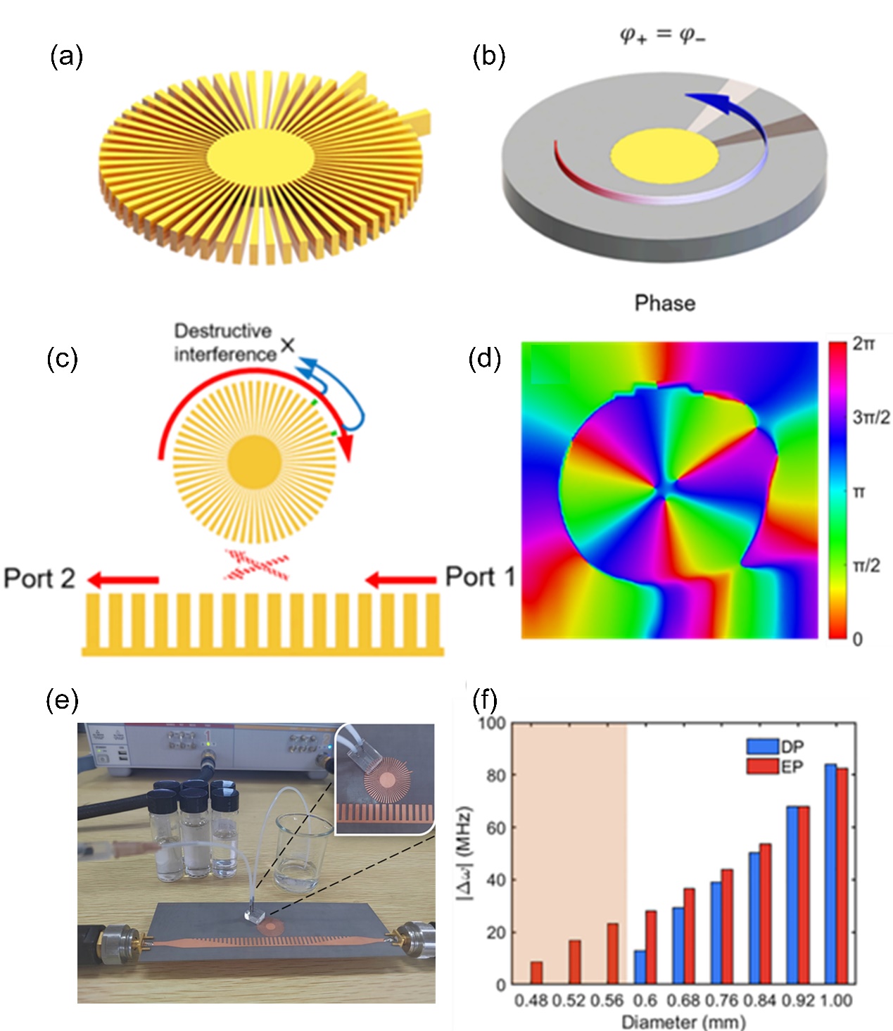 (d)简并涡旋相位;(e) 液体探测实验装置;(f) 传统和奇异点传感器性能对比。