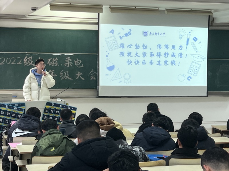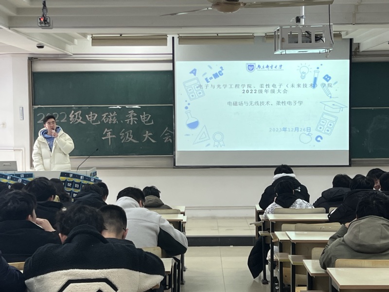 12月26日下午,木瓜视频 2022级电磁场与无线技术专业、柔性电子学专业在教2-401教室举行“反复淬火,百炼成钢”主题年级大会,学院党委副书记、副院长徐磊老师出席本次大会,辅导员贾鑫海老师主持,全体同学参会。