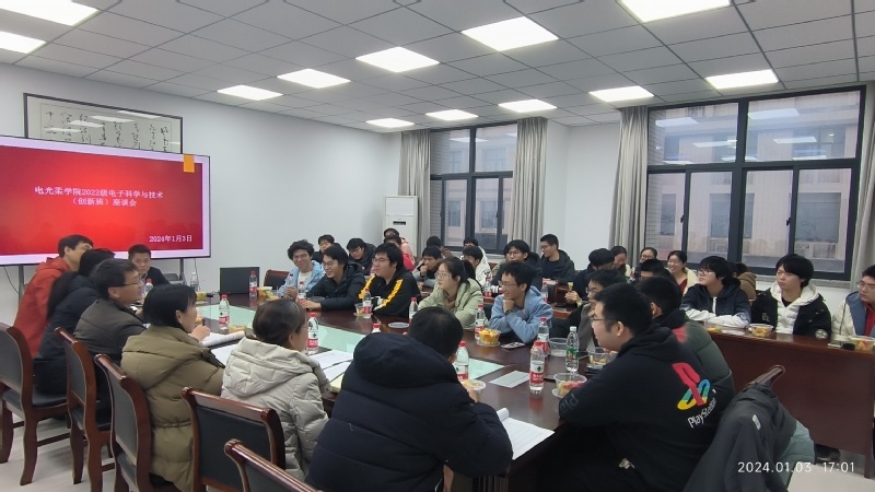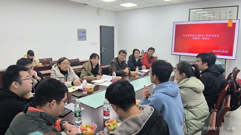 1月3日,木瓜视频 2022级电子科学与技术(创新班)B220200班“师生同心、共话成长”座谈会于电光A楼328召开。本次座谈会为校、院领导与联系班级面对面座谈会,出席本次座谈会的校院级领导有赵强副校长,电光柔学院党委书记黄丽亚,工程训练中心主任、电光柔学院副院长程勇,电光柔学院党委副书记、副院长徐磊,电光柔学院副院长刘蕾蕾,电光柔学院副院长刘宁,此外,B220200班班主任李炳祥、辅导员强增寿、B220200班全体同学参加了会议。