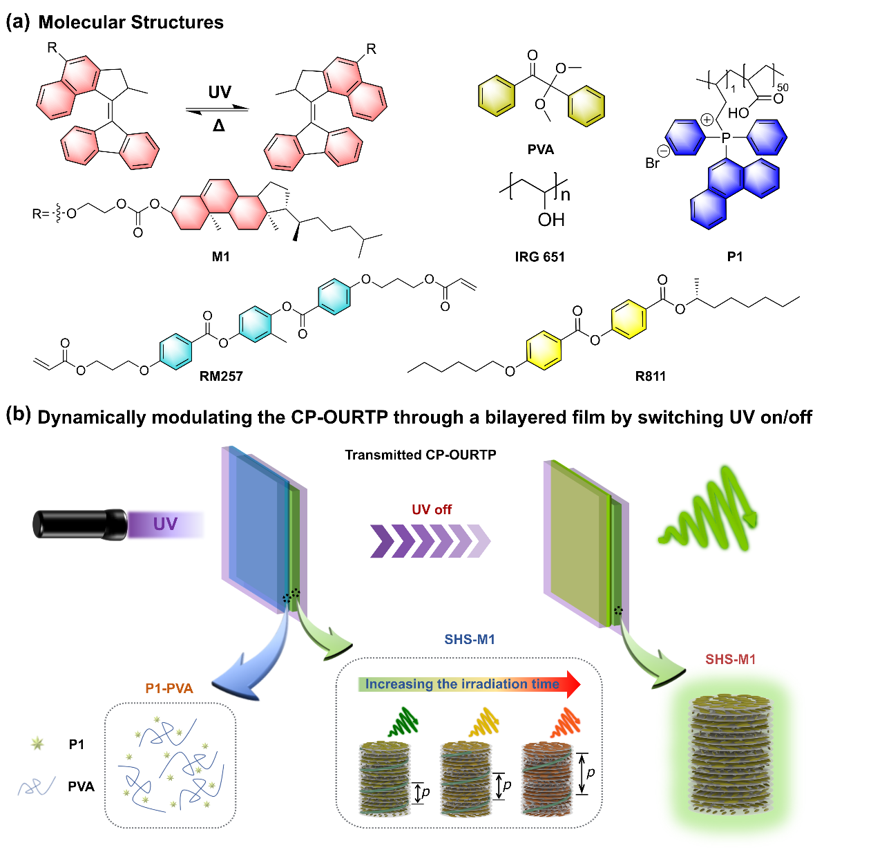 图 1.(a)圆偏振有机室温磷光的实现材料和(b)超结构的螺距调控示意图。