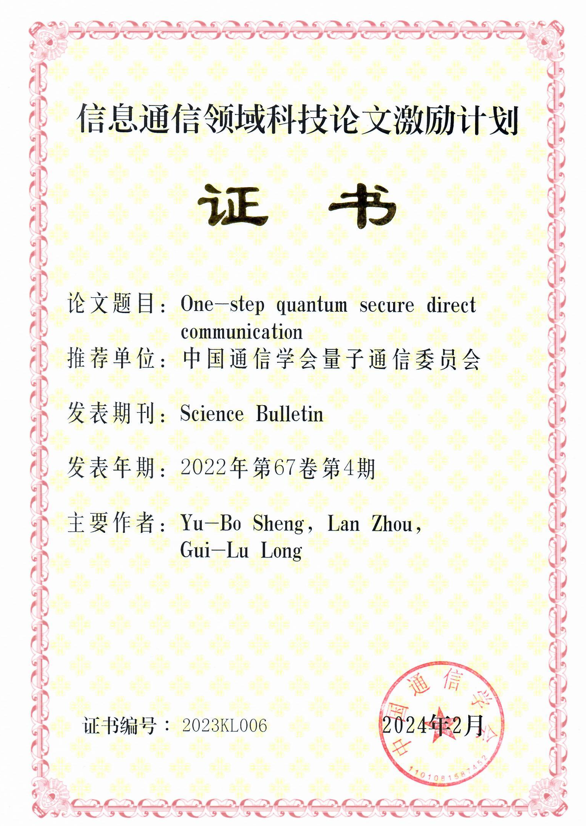 近日,中国通信学会公布了2023年度信息通信领域科技论文激励计划遴选结果。我院盛宇波教授、理学院周澜教授、清华大学龙桂鲁教授合作发表在Science Bulletin的论文“One-step quantum secure direct communication”入选2023年度信息通信领域科技论文激励计划。