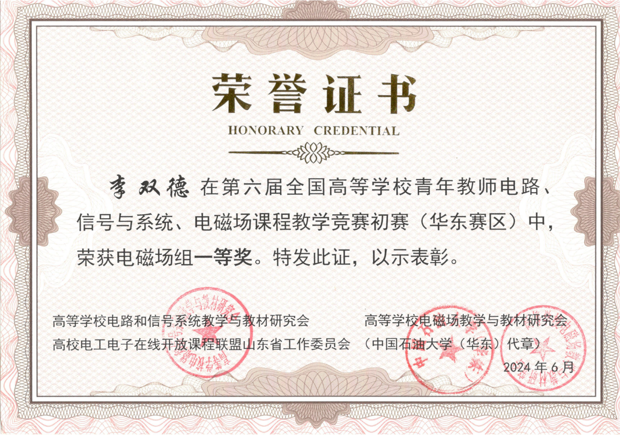 近日,第六届全国高等学校青年教师电路、信号与系统、电磁场课程教学竞赛初赛(华东赛区)在中国石油大学落下帷幕。来自浙江大学、同济大学、山东大学等6省1市(江苏、浙江、福建、安徽、山东、江西、上海)的40余所高校的教师同台竞技。经过激烈角逐,我院青年教师李双德荣获电磁场组一等奖第一名,展示了我院本科教学水平和青年教师风采。