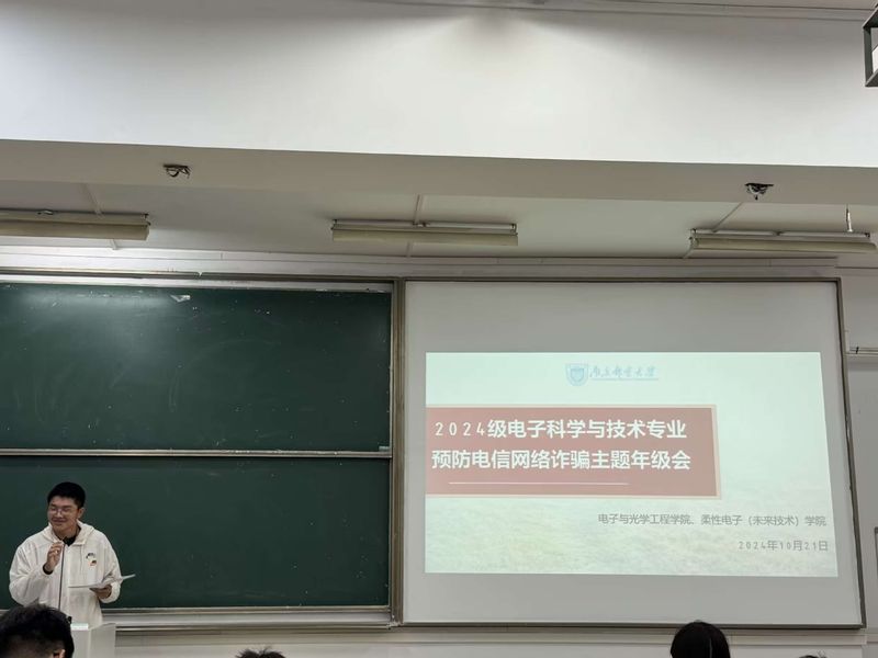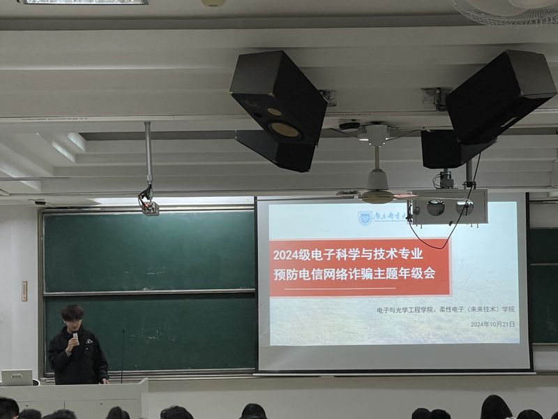 10月21日晚上,木瓜视频 2024级电子科学与技术专业于教2-201召开预防电信网络诈骗主题年级会,旨在提高大学生的安全防范意识,有效预防电信诈骗案件的发生。会议由电科一班副班长李旭、电科六班副班长朱鹏宇主持,辅导员刘振和本专业全体新生参加本次大会。