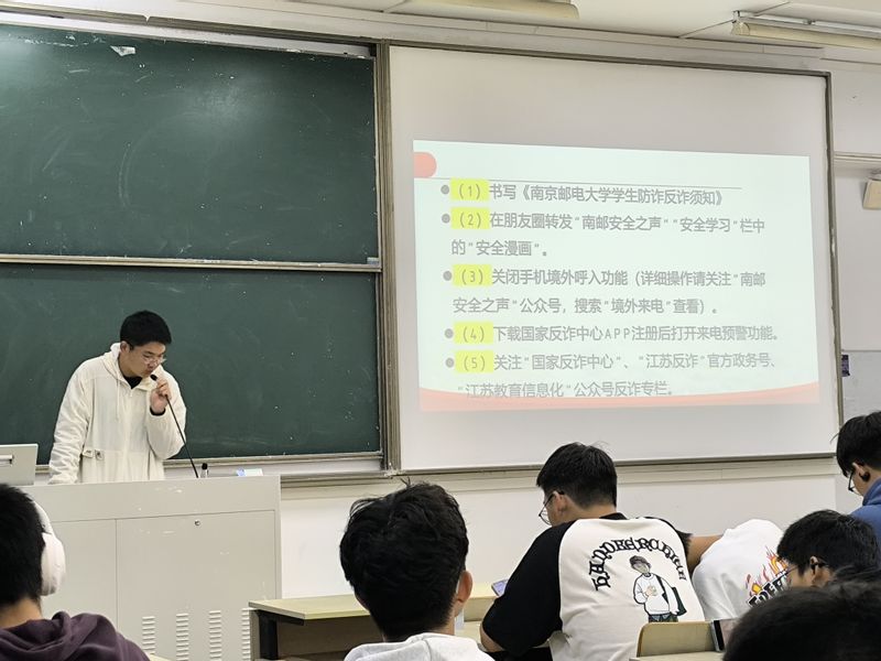 随后朱鹏宇向同学们详细介绍了“同学们预防诈骗要做些什么?”,其中包括书写《木瓜视频 大学生防诈反诈须知》、关注南邮安全之声公众号、进行安全学习、下载国家反诈app、关闭手机境外呼入功能等等,使同学们对预防电信网络诈骗有了一个清晰的认识。同时,为了让同学们更好地掌握预防电信诈骗的方法,李旭通过生动的案例向同学们介绍了电信诈骗的常见形式,如网络贷款诈骗、刷单返利诈骗、“杀猪盘”诈骗、冒充电商物流客服诈骗等。