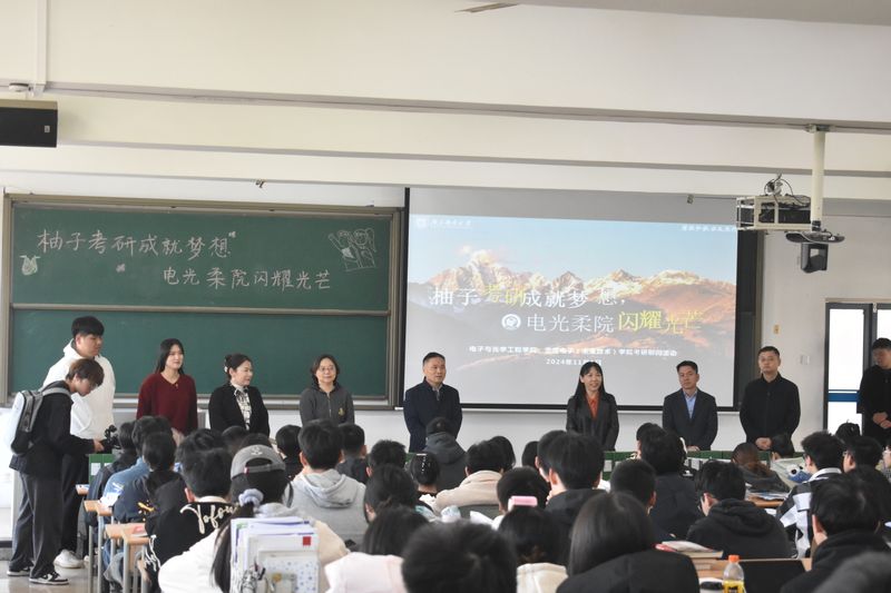 随后在教4-400分会场活动同样进行得如火如荼。分会场由校党委副书记蒋国平、电光柔院党委书记黄丽亚、学院党委副书记、副院长徐磊和2025届毕业班辅导员们送上最亲切的问候与祝福。蒋书记从考研方面,依次从政治、英语、数学、专业课四个方面,给同学们分享学习经验,鼓励大家要勇敢面对困难,坚持到底就是胜利。在蒋书记的带动下,现场气氛热烈而激昂,同学们纷纷表示将以更加坚定的信念迎接考研的挑战。