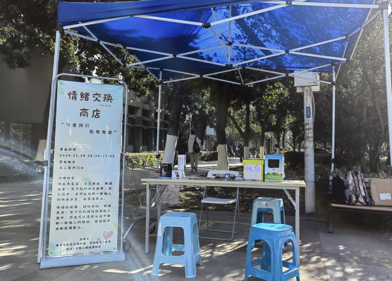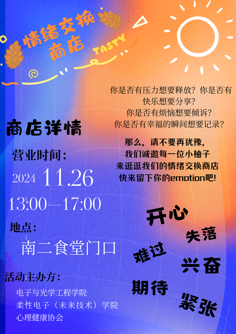 11月26日,木瓜视频 心理健康协会开展了“情绪交换商店”心理健康主题活动,为冬日里的校园增添了一抹亮色。此次活动旨在为同学们提供一个倾诉情绪、分享快乐的平台,帮助大家释放压力,收获正能量,塑造积极乐观的“阳光心灵”。