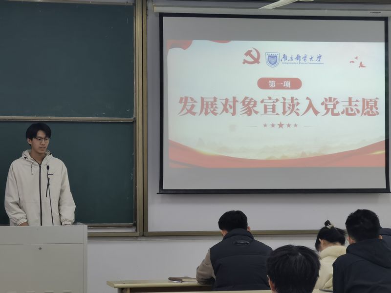 首先全体参会人员起立,齐声唱响中华人民共和国国歌,激昂的国歌旋律在教室内回响,唤起了在场每个人的爱国热情和对党的忠诚。随后,发展对象们依次走上讲台,充满激情地宣读他们的入党申请书,展现了他们对党的深厚情感和为人民服务的坚定决心。