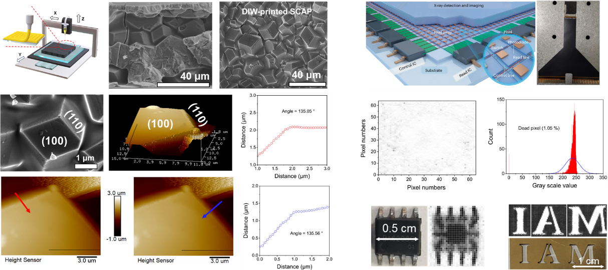 作为当前最受瞩目的X射线探测材料,钙钛矿及其X射线探测器的研发为我国突破X射线成像这一“卡脖子”技术带来了契机,然而,兼容TFT电子读出背板高质量钙钛矿厚膜的制备是当前限制钙钛矿X射线探测器发展的瓶颈难题。有鉴于此,我院赵强教授、徐修文教授团队自主发展了一种全新的直写印刷(Direct-ink-writing, DIW)单晶组装钙钛矿制备工艺,研制出TFT集成的X射线面阵探测器,实现了高分辨的X射线数字成像。相关成果以“Direct ink writing of single-crystal-assembled perovskite thick films for high-performance X-ray flat-panel detectors”为题发表于国际权威期刊Advanced Functional Materials