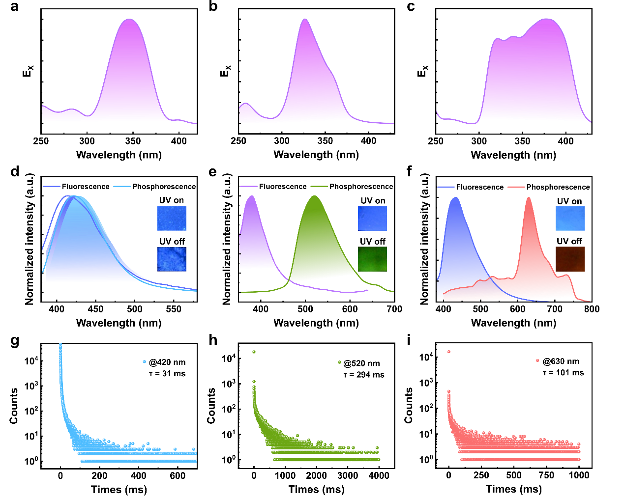 为了进一步了解CSE-RTP薄膜的光物理性质,作者还测量了CSE-R-P1、CSE-R-P2和CSE-R-P3薄膜的激发光谱、稳态发光光谱、延迟发光光谱和寿命曲线(图2)。在365 nm UV光照射下,这些薄膜都发射蓝色荧光。在移除UV光源后,分别发射出明亮的蓝色、绿色和红色余辉(图2d-f中的插图),发射的中心波长分别为420 nm、520 nm和630 nm(图2d-f)。此外,CSE-R-P1、CSE-R-P2和CSE-R-P3的寿命分别为31 ms(420 nm)、294 ms(520 nm)和101 ms(630 nm)(图2g-i)。