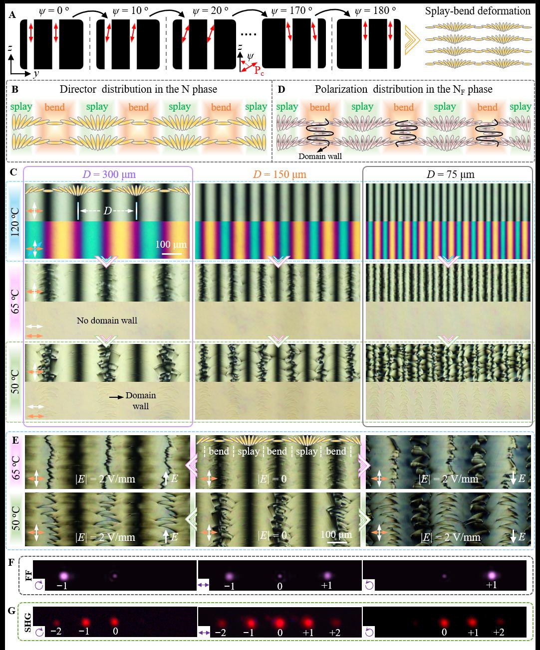 近日,我院李炳祥教授、南京大学陆延青教授和华南理工大学Satoshi Aya教授开展科研合作,在铁电液晶领域取得了新进展,成功实现了流体铁电畴的多维度操控,展示了空间极化分布在非线性光场调控的应用。相关工作以“Domain engineering in ferroelectric nematics for nonlinear optical modulation发表在Science Advances上。南京大学陆延青教授、我院李炳祥教授、华南理工大学Satoshi Aya教授和南京大学刘袁博士为本文共同通讯作者。南京大学博士生李超逸、南京大学助理教授顼晓仪、我院青年老师杨吉丹为本文第一作者。南京大学马玲玲助理教授、张勇教授,我院研究生孙路瑶、黄志军和Susanta博士亦对本文有重要贡献。