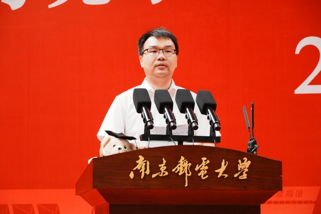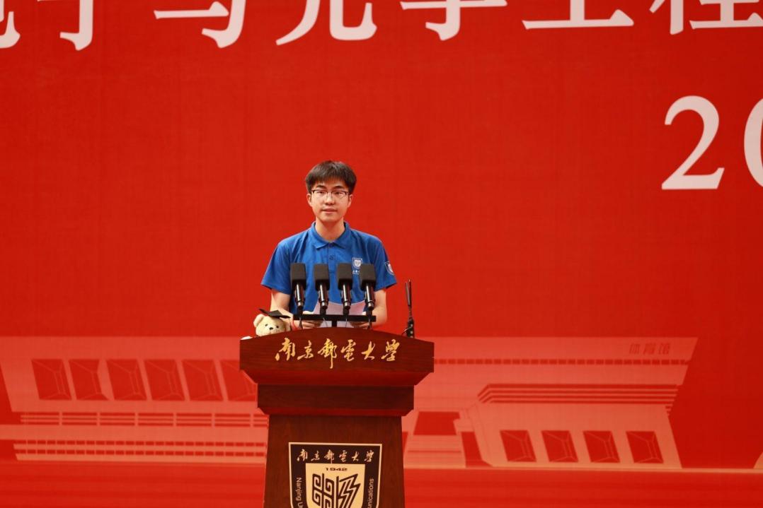 2025级研究生新生代表、校优秀本科毕业生——2020级光电信息科学与工程专业学生、江苏省优秀学生干部,全国第26届研究生支教团优秀支教教师贺哲发言,他分享了自己的青春成长历程,并号召同学们恪守学术规范、锤炼技术能力、勇担时代使命,怀抱梦想又脚踏实地,敢想敢为又善作善成,让青春在全面建设社会主义现代化国家的火热实践中绽放绚丽之花。